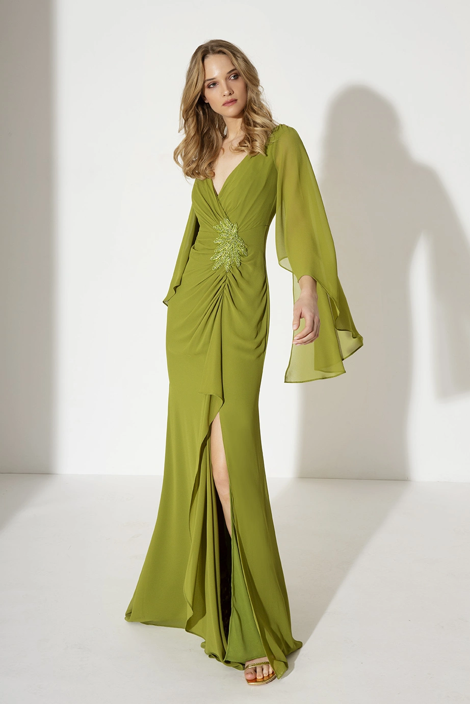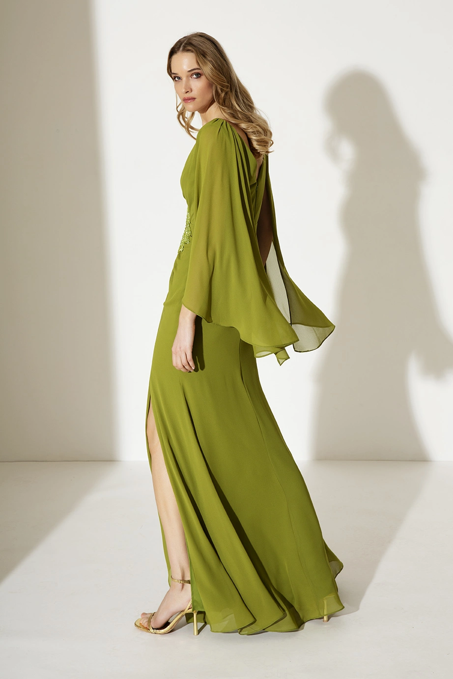 Allure Evenings μακρύ πράσινο φόρεμα, Μουσελίνα σε πράσινο χρώμα της ελιάς, Ντραπέ στο μπροστινό μερος, Λεπτομέρεια κέντημα με χάντρες, Ενισχυμένα καπς στο στήθος, Κρουαζέ, Cape sleeves, Μικρό V στην πλάτη, Κλείνει στο πίσω μέρος με φερμουάρ, Φοδραρισμένο
