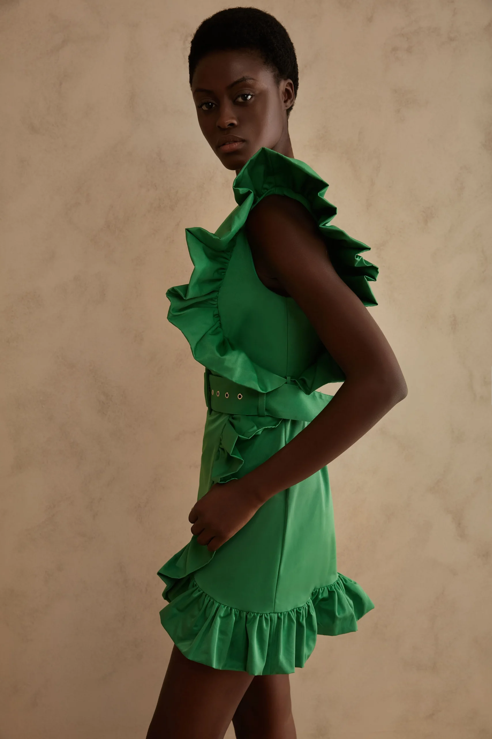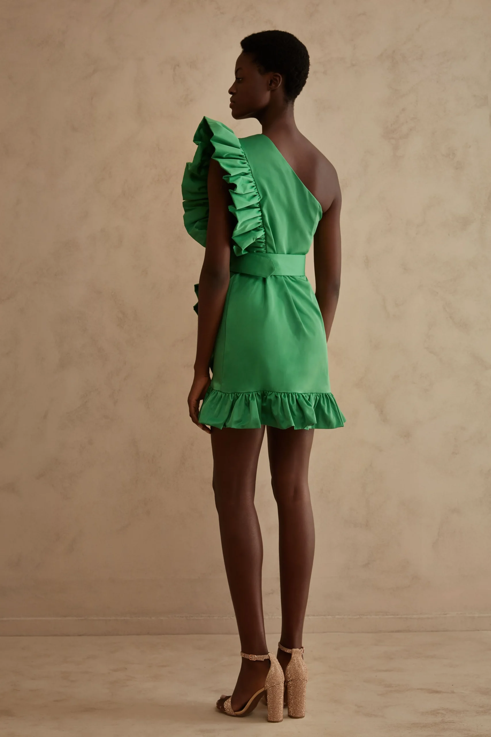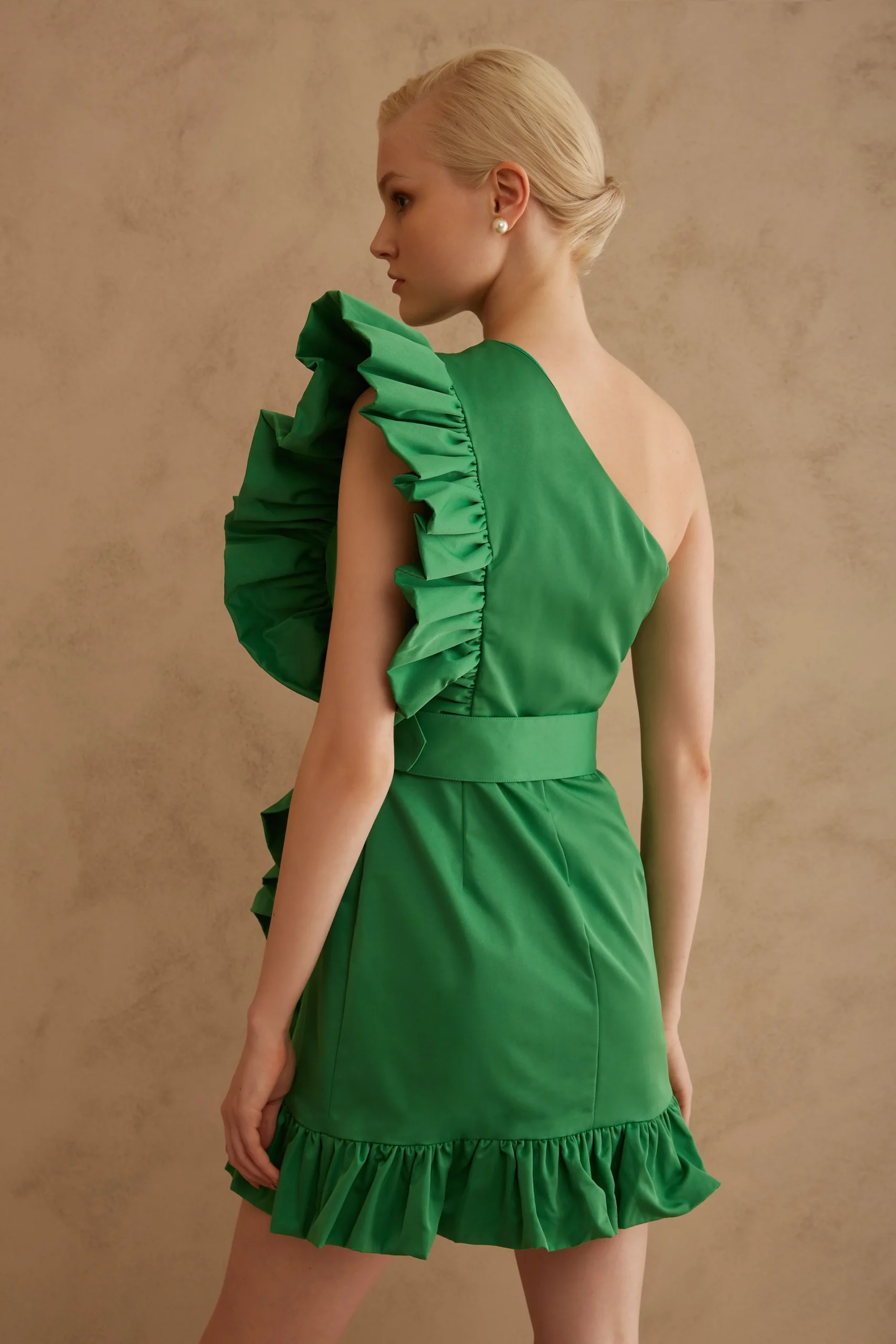 Twins Fantasy κοντό πράσινο φόρεμα με έναν ώμο, Βολάν λεπτομέρεια, Κρυφό φερμουάρ στο πλάι, Ρυθμιζόμενη και αποσπώμενη ζώνη, Φοδραρισμένο